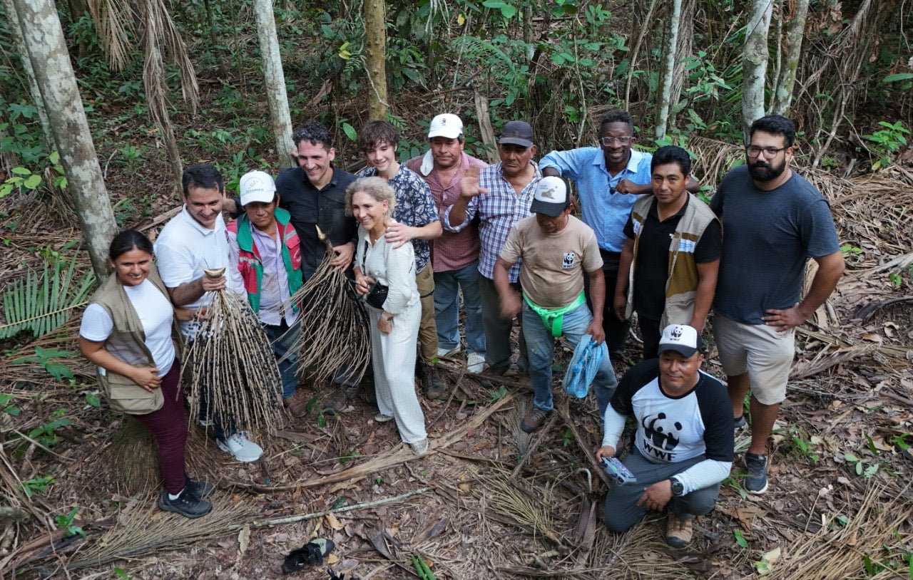 Group of people in a Amazon forest with acai branches, posing for a photo.